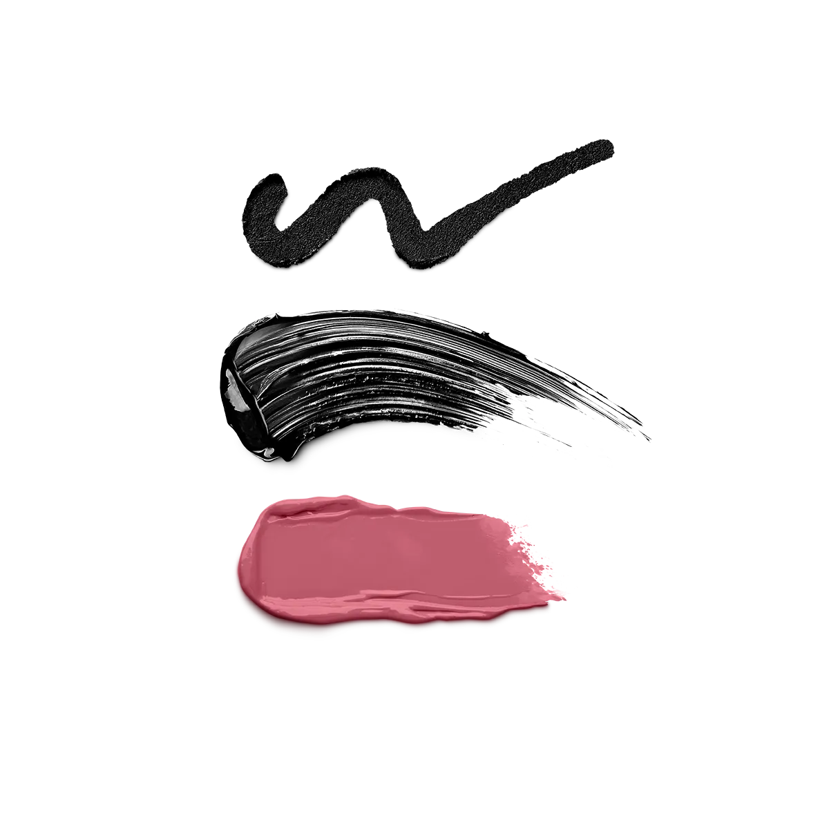 Conjunto de maquiagem para presente composto por uma máscara com efeito volumizador, um lápis de olho preto, um batom e um blush líquido em formato mini, dentro de uma requintada pochete.